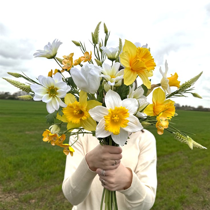 Open daffodils sit alongside delicate meadow florals and airy grasses, creating a natural balance of colour, texture and movement. The result is relaxed and organic -as if gently gathered from the countryside.
