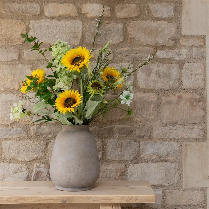 Sunshine on a stem - nothing quite beats the warmth and positivity that a sunflower brings. Our Sunlit Meadow arrangement features this bold and beautiful focal flower beside a collection of subtle green and white wildflower favourites. Faux paniculata hydrangeas, nigella love in the mist, narrowleaf clovers, mini flowers and ranunculus support our artificial sunflowers in a softly textured ceramic vase for a finish reminiscent of picking flowers on a stroll through a Summer meadow.