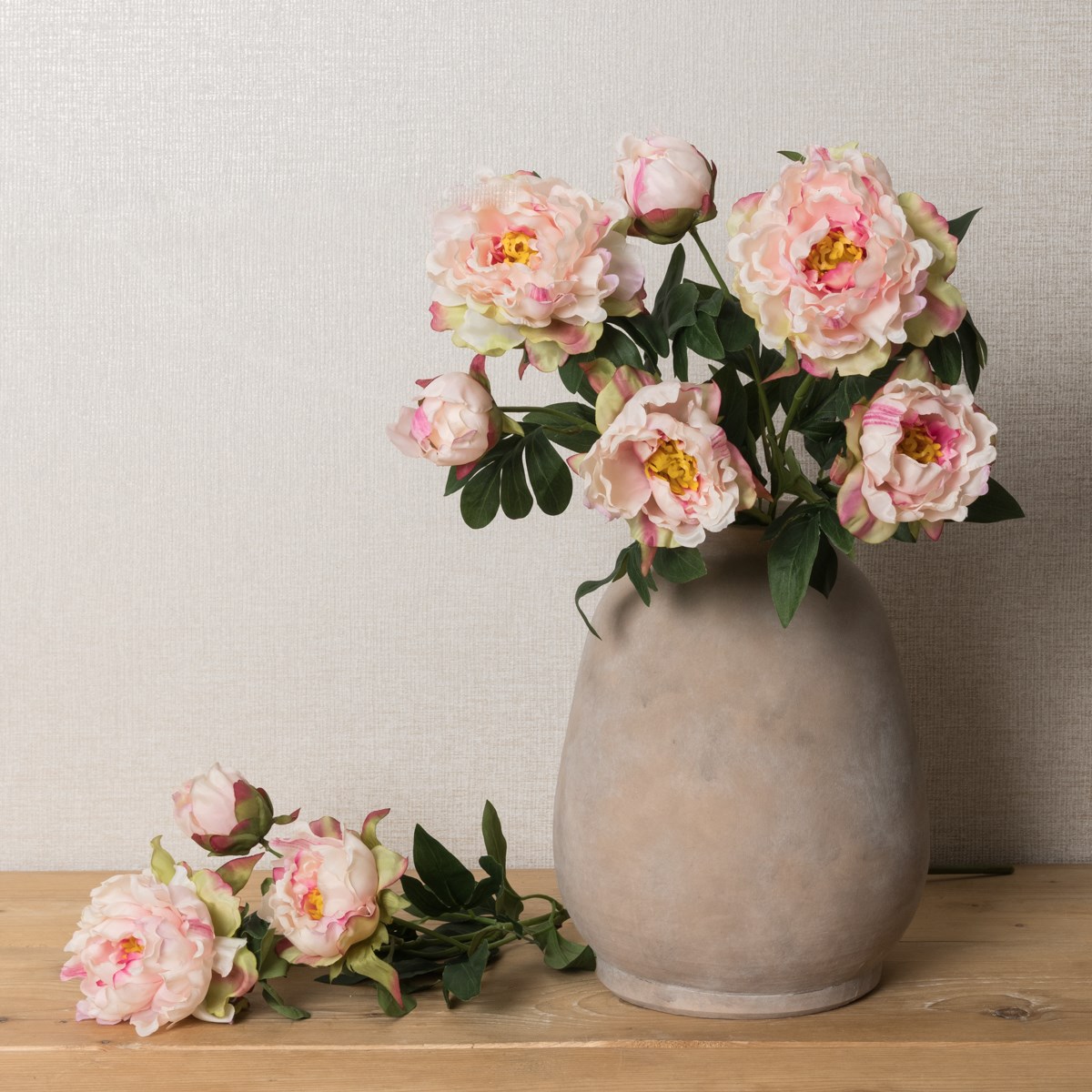 Boasting both a wild beauty and a poised elegance, our Light Pink Faux Garden Peony is a beautiful and blousy stem featuring two fluffy flower heads and a single closed bud. Hand painted tonal colours adorn each delicate petal for a realistic finish, while a large amount of luscious foliage frames each flower - adding to its 'just picked from the garden' feel.