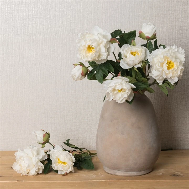 Boasting both a wild beauty and a poised elegance, our White Faux Garden Peony is a beautiful and blousy stem featuring two fluffy flower heads and a single closed bud. A large amount of luscious foliage frames each flower, adding to its 'just picked from the garden' feel.