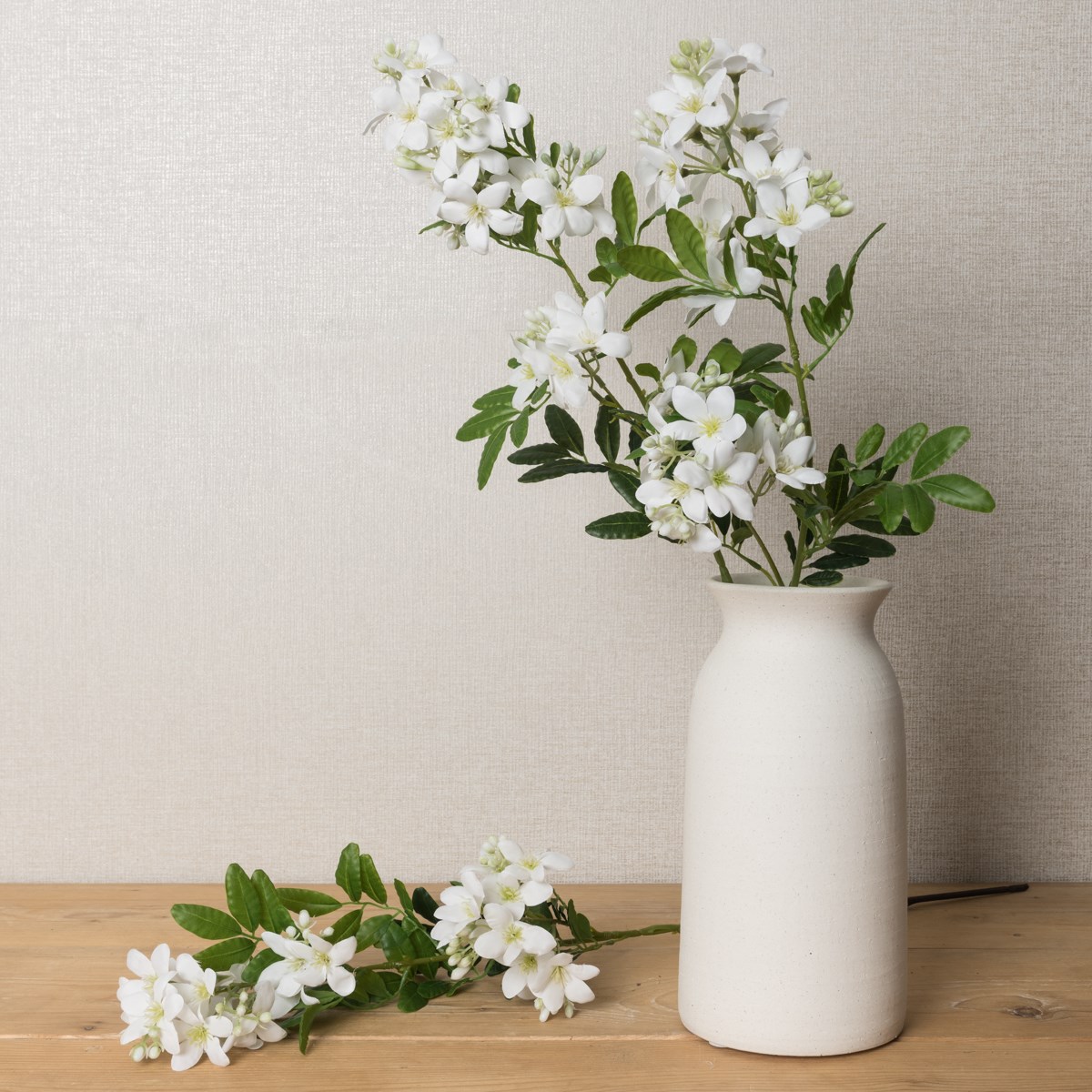 The perfect accompaniment to many of our artificial flowers, our Faux Jasmine Stephanense stem features clusters of bright white flower heads, nestled amongst textured green oval-shaped leaves. Dainty buds hidden between petals and leaves add to this stems realistic appearance of a flower still blooming.