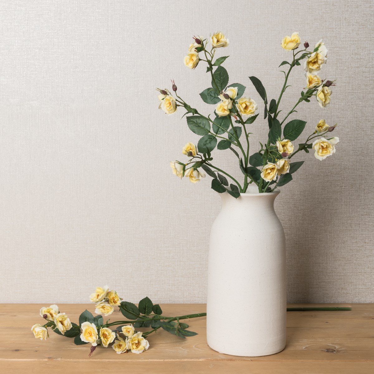 A wonderfully faithful recreation of a much-loved British garden staple, our lemon ECO Faux Isabella Wild Rose features small, delicate flowerheads in full bloom, accompanied by tiny buds just starting out and some fit to burst, finished by a scattering of deep green, serrated edge leaves.