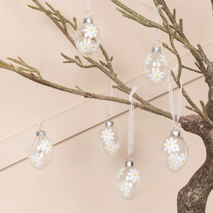 Bring a delicate, springtime feel to your Easter décor with these 6 Glass Daisy Easter Egg-shaped Hanging Decorations. Each egg is crafted from clear glass and finished with a charming daisy design, creating a light and airy look that feels fresh, simple and timeless.
