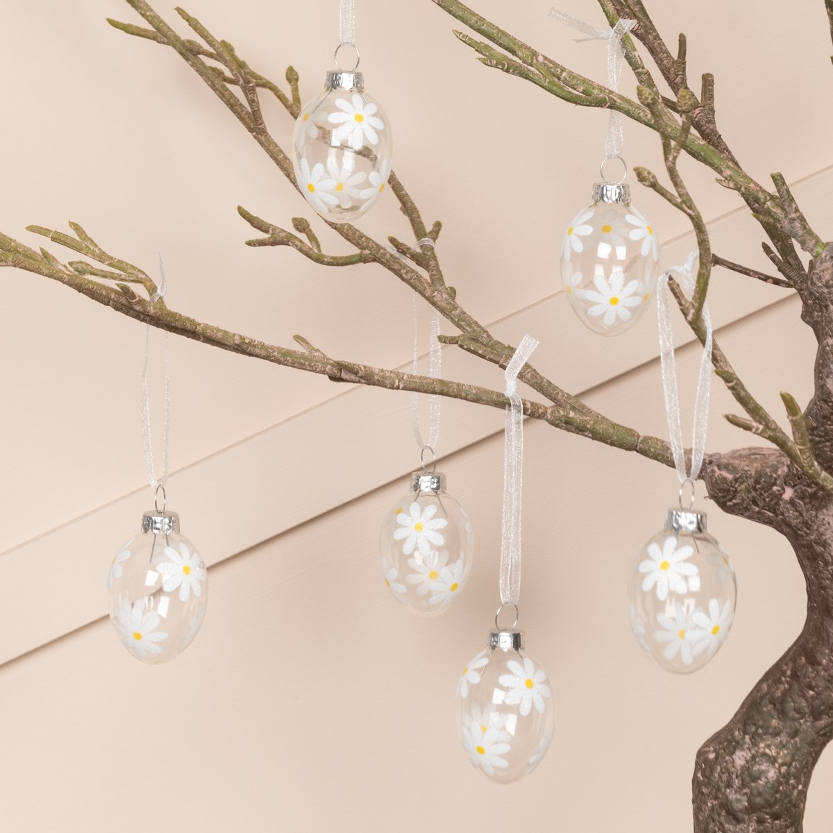 The transparent glass allows light to pass through beautifully, while the soft white floral detailing keeps the overall effect calm and understated. Finished with hanging loops, these glass Easter eggs are easy to style on branches, Easter trees, hooks or as part of a table or mantel display.
